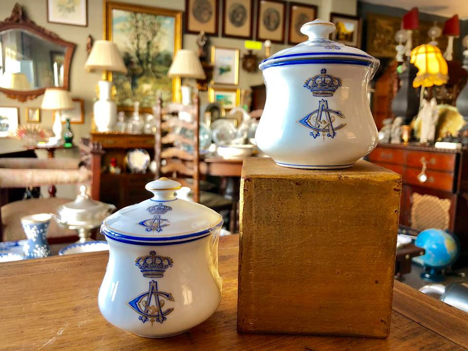 Par de cremeiras de porcelana Vista Alegre com o monograma Real. Texto PT/ES
